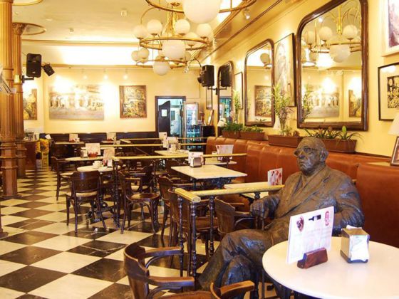 En un momento tuve ganas de tomar un café caliente, de entrar en calor. Así que me metí en un Café cercano al teatro Calderón, en uno de los pocos locales de la ciudad con mesas de mármol y con decoración aún de principios del siglo XX. Es un lugar muy literario, con cuadros de escritores que llenan las paredes. Ahí están Valle-Inclán, Antonio Machado, Cela, Rosa Chacel, Paco Umbral, Miguel Delibes… Llegué a la barra entre la gente y el camarero tardó en reparar en mí. Hasta que me trajo el café, miré las mesas, todas ocupadas, pero mi atención se detuvo en una.
