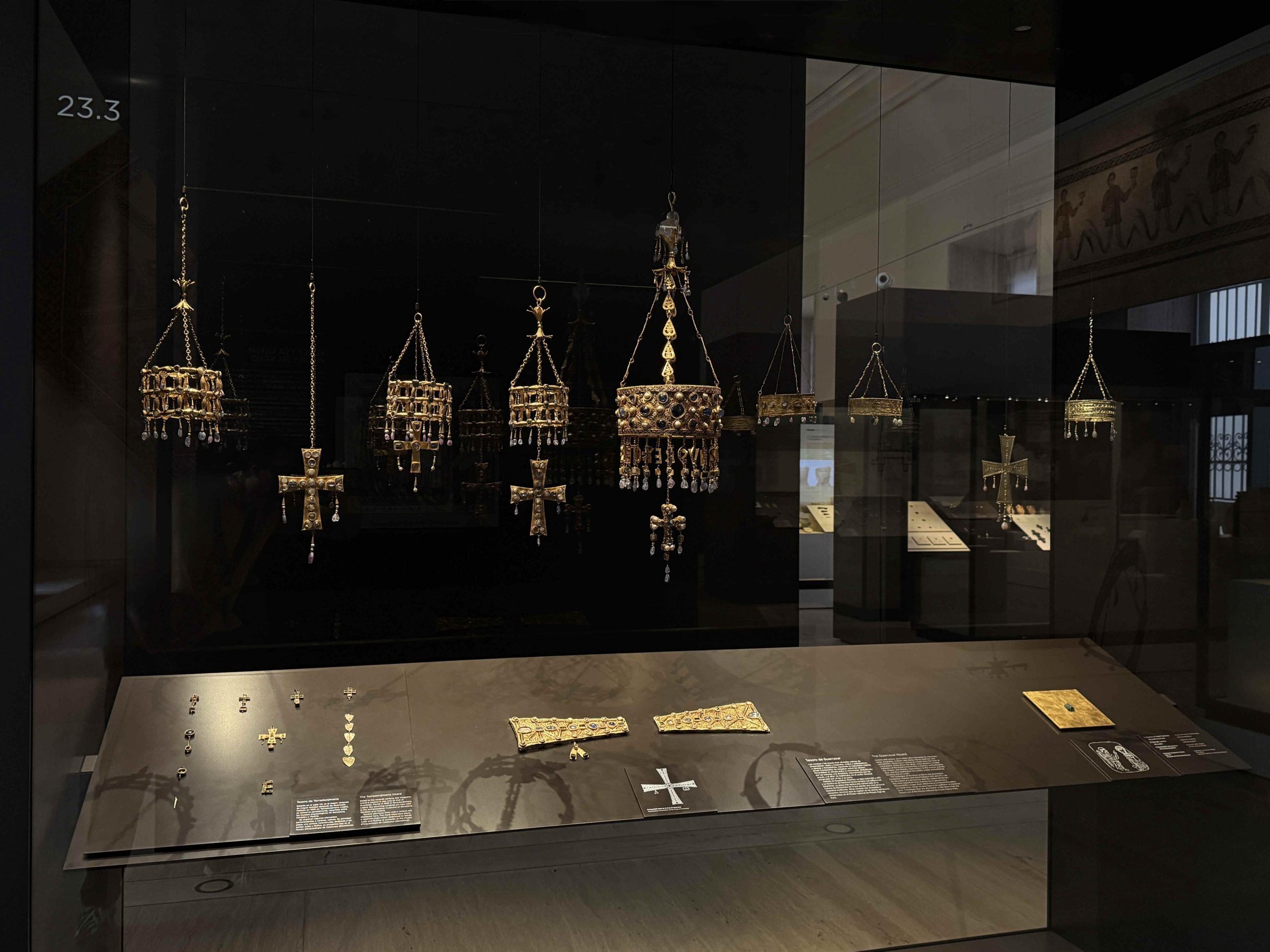 El Tesoro de GuarrazarHallado en 1858 en Guadamur (Toledo), representa la cumbre de la orfebrería tardoantigua y la máxima expresión del periodo visigodo en Hispania. Cronológicamente su producción se sitúa en el siglo VII. Sus coronas votivas y cruces de oro, piedras preciosas y perlas son testimonio de la estrecha relación entre monarquía e Iglesia.