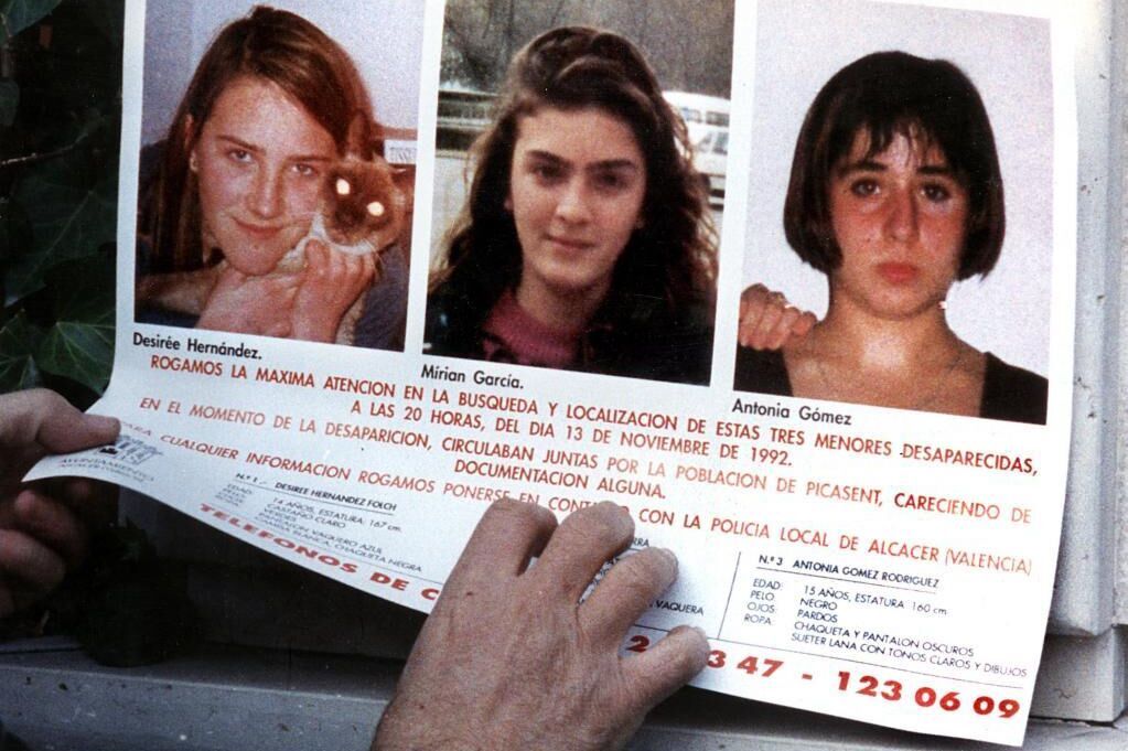 En la tarde del viernes 13 de noviembre de 1992, en la calle principal de Picassent, un pueblo valenciano muy cercano al de Alcàsser, dos jóvenes delincuentes de amplio historial —uno de ellos, Antonio Anglés, en busca y captura por no volver a prisión de un permiso penitenciario en el mes de marzo por el secuestro y tortura de una toxicómana (Nuria Pera)—, que iban en un Opel Corsa blanco de dos puertas, montan —o quizá secuestran— a tres chicas adolescentes de Alcàsser que hacían autostop —dos de 14 años y una de 15— para llegar a la discoteca Coolor, a las afueras de Picassent, a una fiesta del instituto. A partir de ahí, desaparecen, y sus cadáveres serán encontrados 75 días más tarde por dos apicultores en la partida de La Romana, un paraje alejado, cercano a la presa de Tous, en una fosa de menos de un metro de profundidad, y de la que sobresalía uno de los brazos descarnados de una de las chicas.