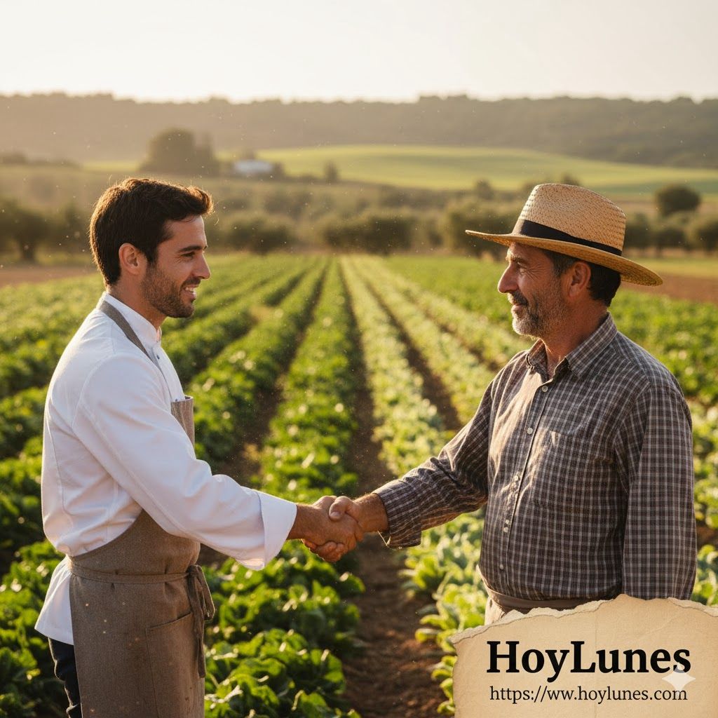 Un chef y un agricultor estrechando la mano frente a un huerto o explotaciones agrícolas.
