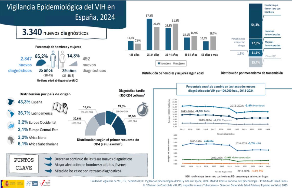 El informe oficial revela que en 2024 se notificaron «3.340 nuevos diagnósticos de VIH» en España, lo que representa una incidencia de 6.95 por 100.000 habitantes, por encima de la media de la Unión Europea. Más grave aún: aproximadamente la mitad de estos casos fueron diagnosticados en fase tardía.