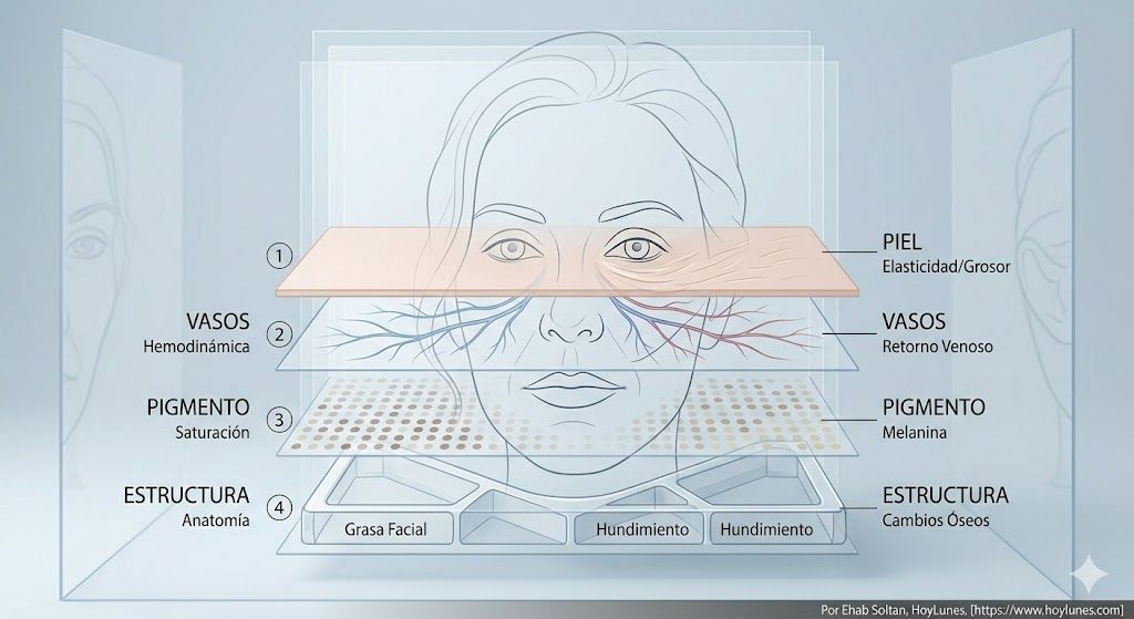 Cambios en la estructura ósea (Sombras): Este es el factor que la cosmética rara vez resuelve. Con el tiempo, ocurren cambios progresivos en la estructura ósea y un desplazamiento de los compartimentos grasos faciales. Al perderse el soporte, se genera un hundimiento. Lo que ves no es una mancha; es una sombra física provocada por la anatomía.